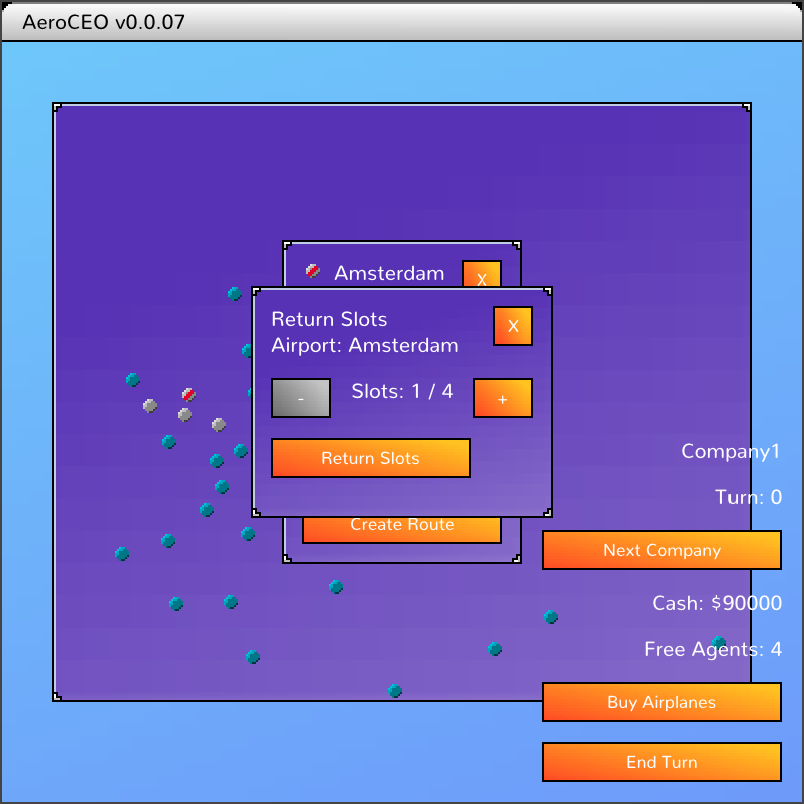 Slots are requested from an airport and currently take a turn to negotiate. In the future there will be a fee to stop players just grabbing everything, and make negotiations take multiple turns, depending on your companies relationship with the different countries.